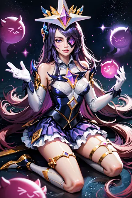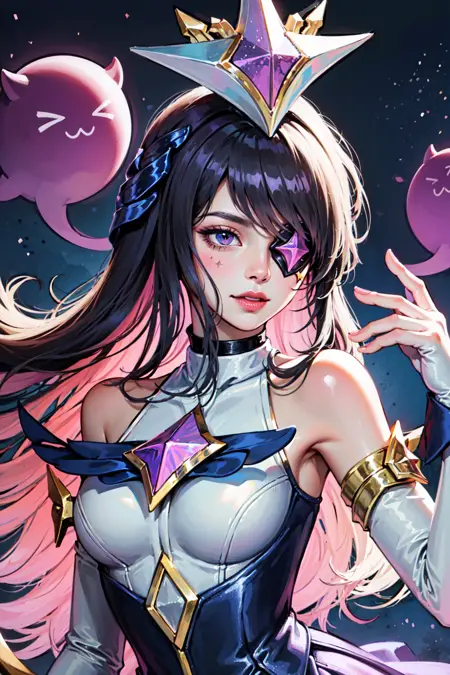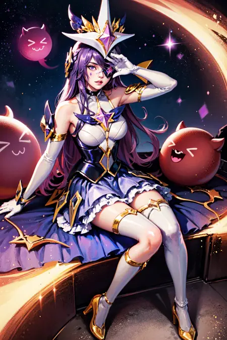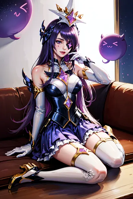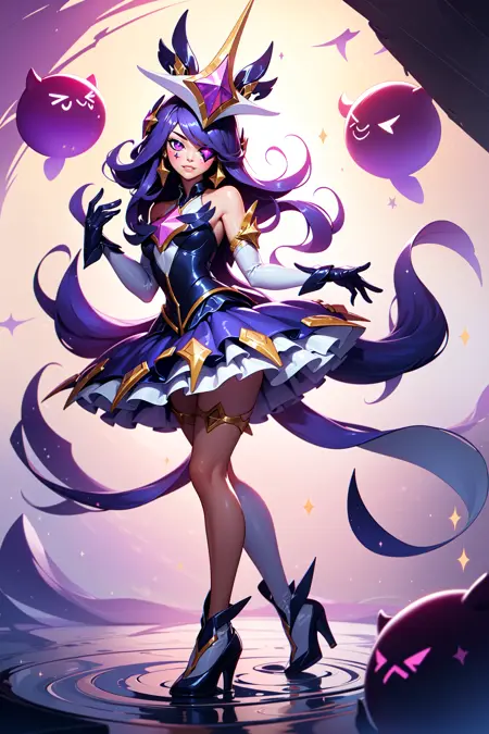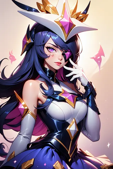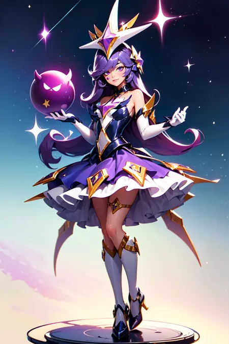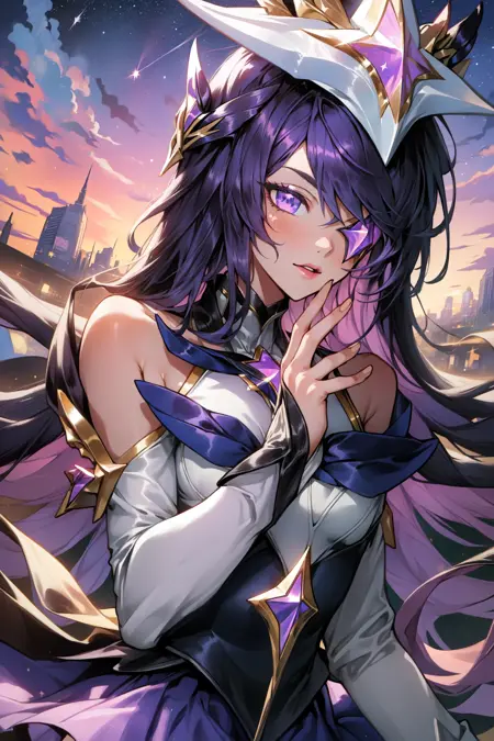 optional tags: purple hair, hair ornament, frilled skirt, dress, eyeptach