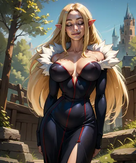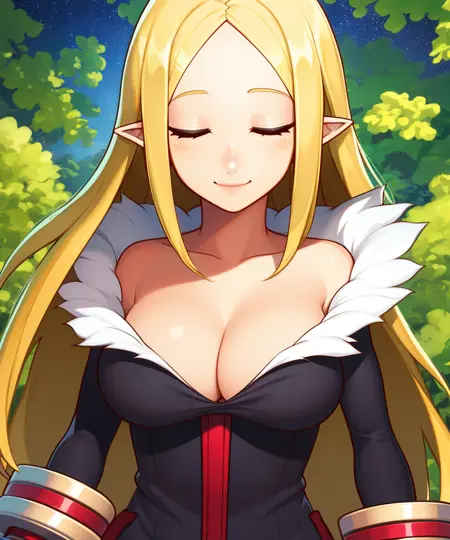 Cleric, blonde hair, long straight hair, closed eyes , - pointy ears,