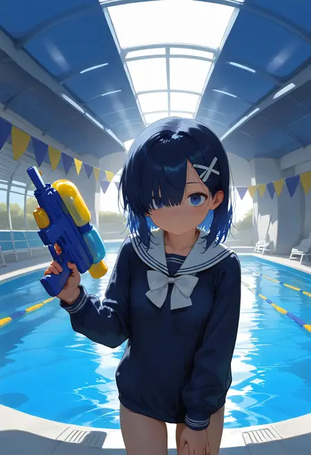 white sailor collar,dark blue serafuku,white bowtie,x hair ornament,