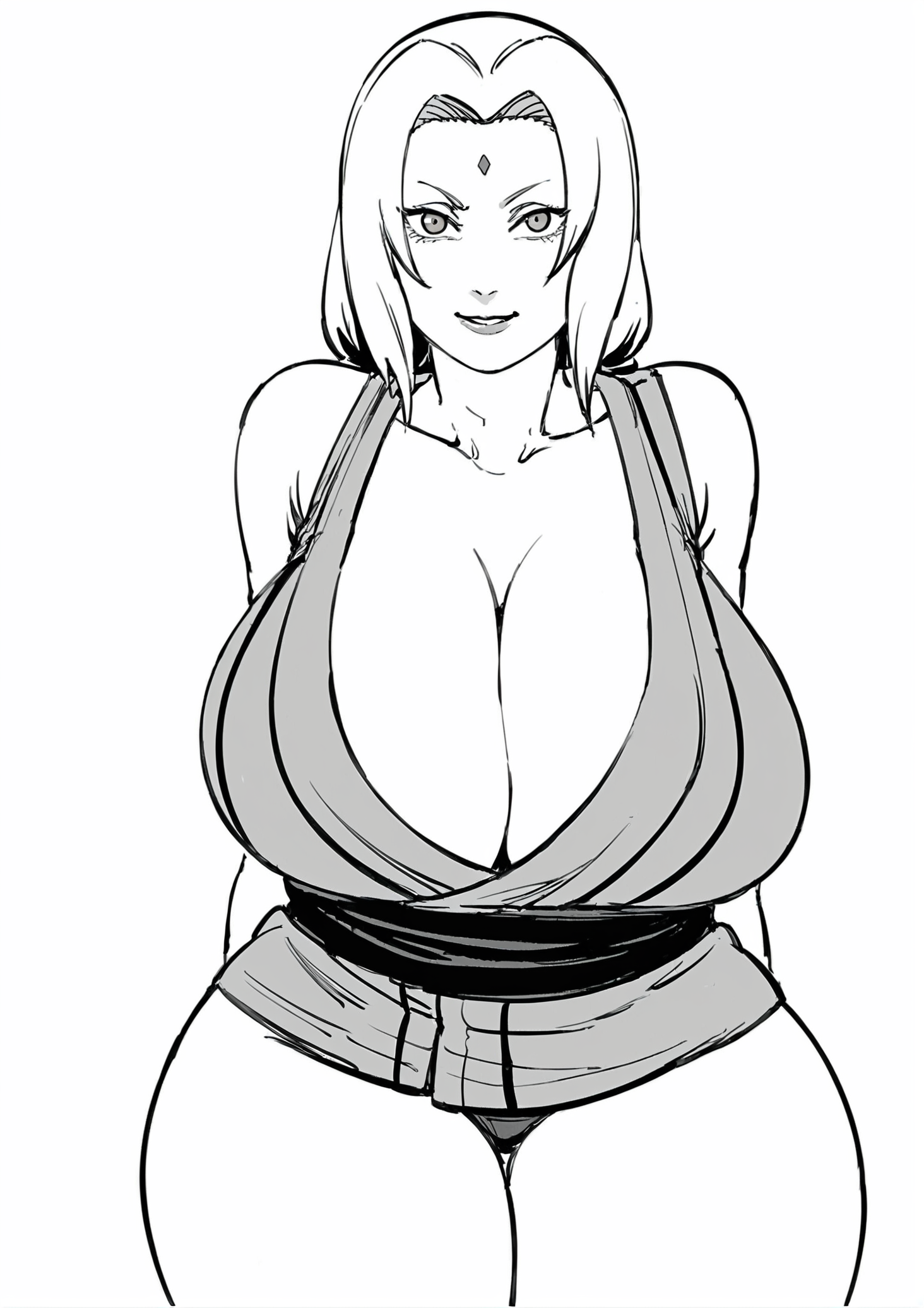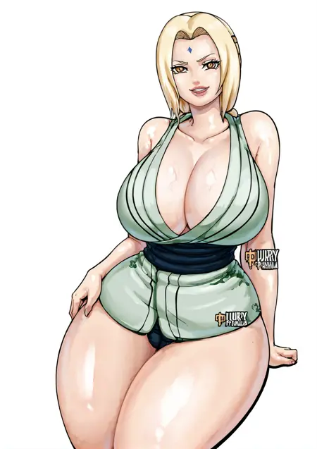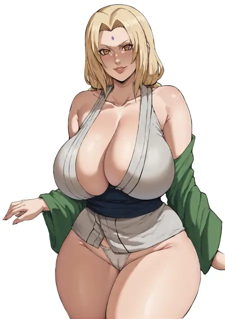 Rekevant prompts: tsunade(naruto), curvy, large breasts, thick thighs, kimono, bare legs, long hair, blonde hair, forehead jewel