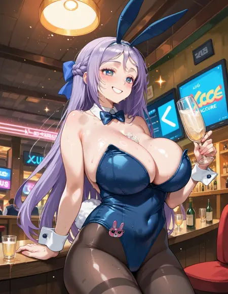 fkwgbun,长发,紫色头发,法式编发,发带,大乳房,花花公子兔女郎,蓝色紧身衣,大腿连裤袜,可拆卸领子,腕部束缚带,蓝色蝴蝶结,假兔尾,衣物下有振动器