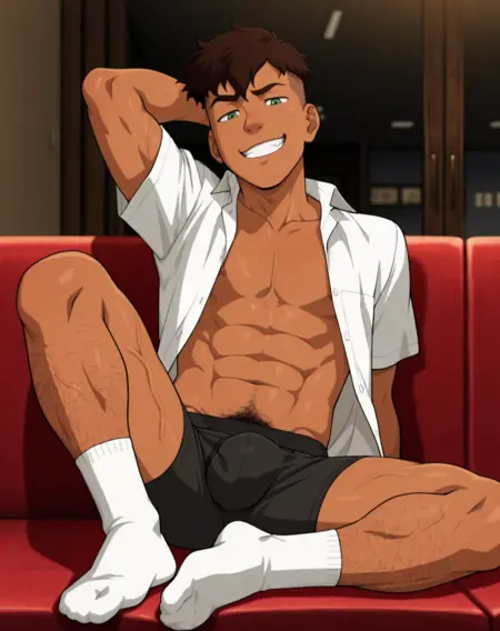 1boy, kai, brown hair, green eyes, dark skin, undercut,