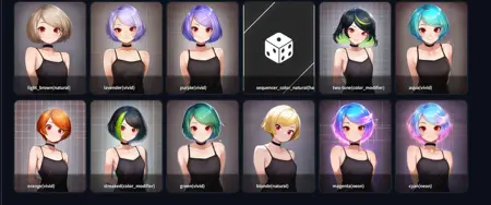 __chara_creator/generators/random_hair__는 형태와 색상 모두에서 무작위 헤어스타일을 생성합니다.__chara_creator/generators/random_hair_colorless__는 형태만 무작위로 생성하고, 색상은 직접 선택할 수 있도록 합니다.__chara_creator/generators/random_hair_extended__는 형태는 물론, 일부 이례적인 조합을 가능하게 하는 확장된 색상 범위를 사용하여 무작위 헤어스타일을 생성합니다.