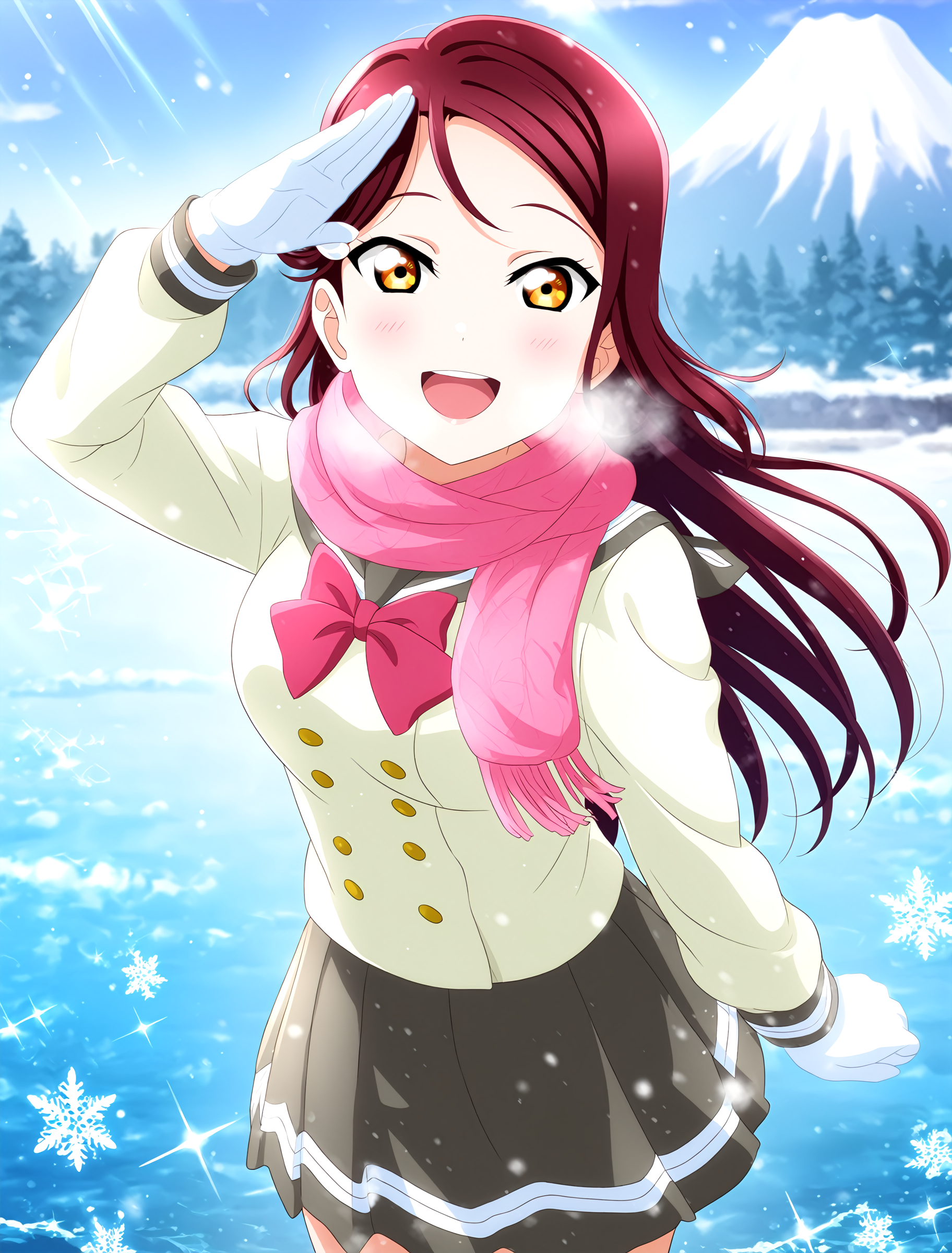 (nijiwin, nijigasaki winter uniform:1.2), long sleeves, black blazer, yellow neck ribbon, white skirt