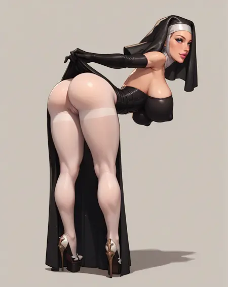 vistrac017, nun, leather, pantyhose, pelvic curtain, corset, veil, gloves, high heels, long dress