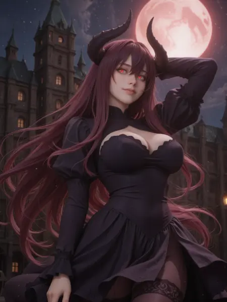 tags: missy_il,very long hair, purple hair,hair between eyes,bangs, red eyes,horns, curled horns,large breasts, dress, cleavage cutout,purple pantyhose