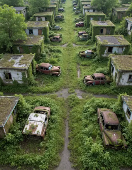 本模型生动呈现了一个后人类景观:城市、住宅及其他建筑的废墟被茂密的绿意彻底包裹。崩裂的混凝土墙体被常春藤的帘幕遮掩,锈蚀的汽车化作藤蔓攀爬的支架,破碎的窗框框住不断蔓延的生命景象。自然已全面接管——根系撕裂路面,花朵在被遗忘的走廊中绽放,树木在人类遗弃的废墟间茁壮生长。