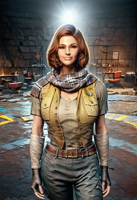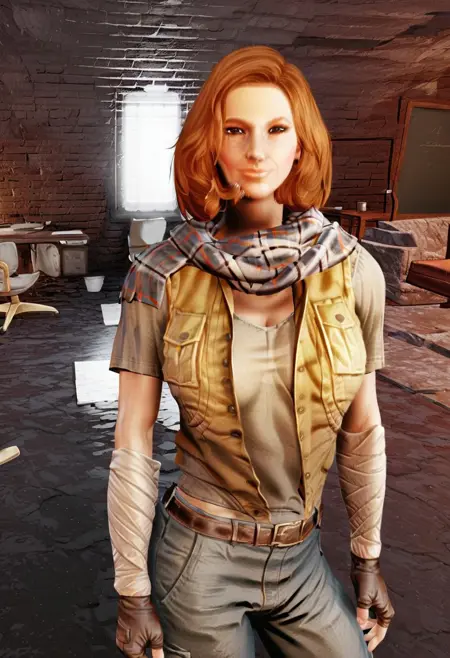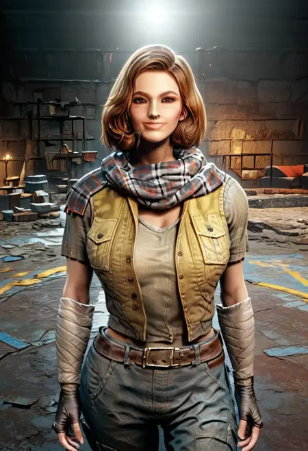 DesdemonaF4, 1girl, solo, brown hair, scarf, vest, shirt, pants, belt, boots, gloves, fingerless gloves, denim pants, short hair, brown eyes, lips, smoking, plaid scarf, bandages, cigarette, jeans, lips, bandaged arms, pockets, large breast, short sleeves,
