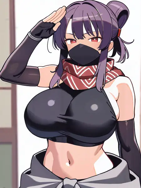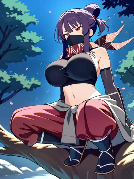 忍者衣装のトリガー語は**"Rin_ninja、忍者服、マウスマスク、忍者マスク、赤いスカーフ、黒いクロップトップ、ハーネック、肩出し、へそ、エルボーグローブ、フィンガーレスグローブ、赤いハレムパンツ、裂けた灰色のスカート、忍者ブーツ"**です。