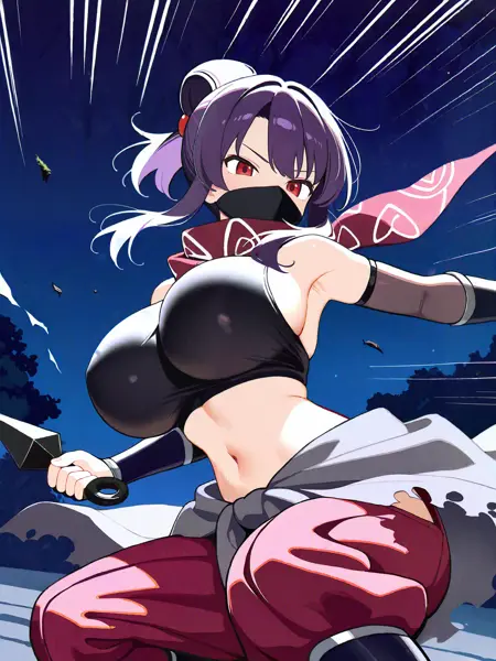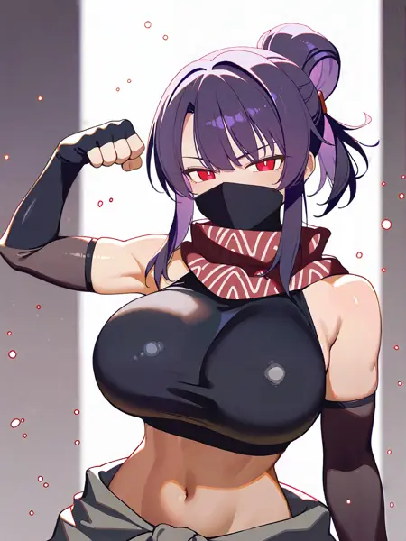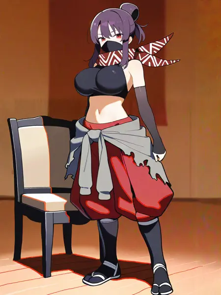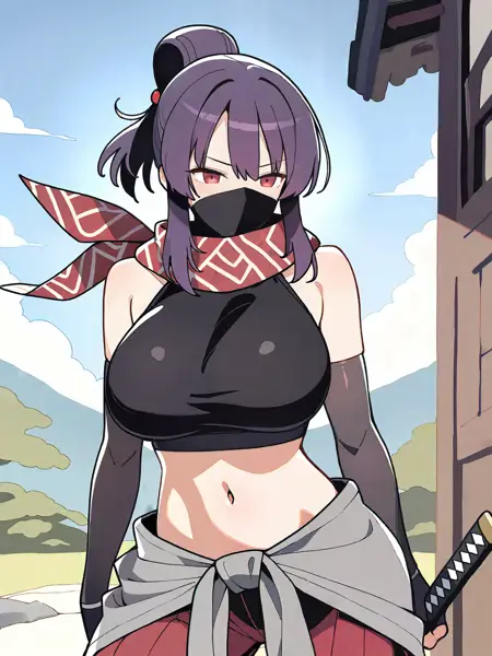 신노비 복장의 트리거 단어는 **"Rin_ninja, 닌자 복장, 입 마스크, 닌자 마스크, 빨간 스카프, 검은 크롭탑, 할터넥, 어깨 노출, 배꼽, 팔꿈치 장갑, 손가락 없는 장갑, 빨간 하렘 바지, 찢어진 회색 치마, 닌자 부츠"**입니다.