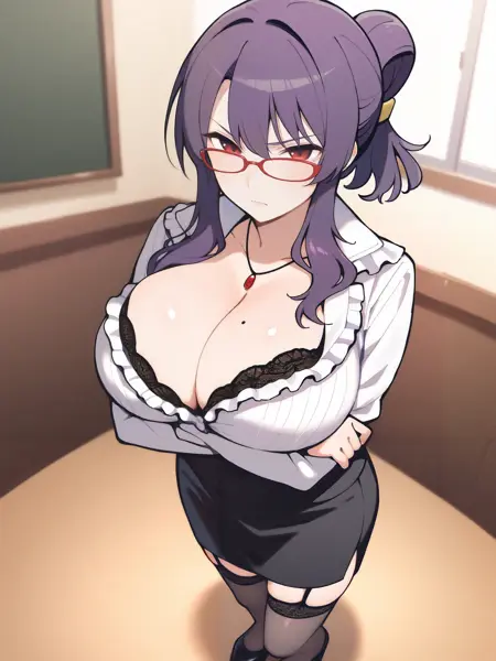 教師の衣装のトリガー語は**"Suzune_Teacher、胸元、ネックレス、白いフリルシャツ、フリル、長袖、黒いレース縁のブラ、胸のほくろ、黒いミニスカート、ガーターstrap、レース縁のレッグウェア、黒いハイヒール"**です。