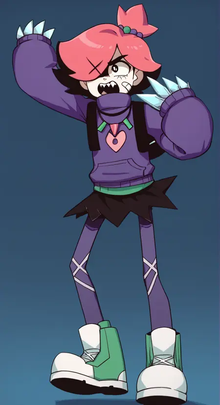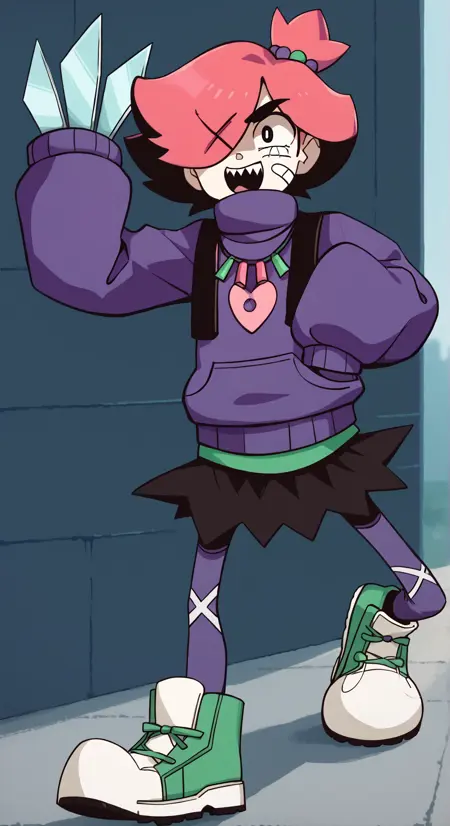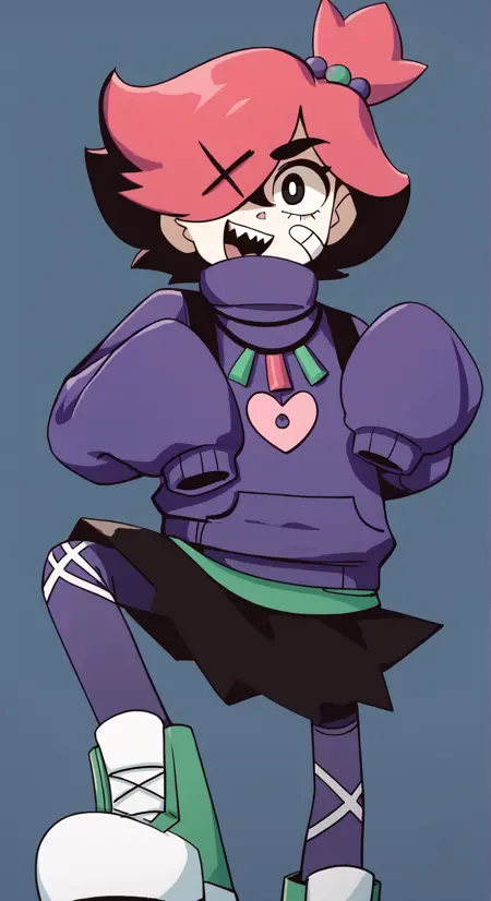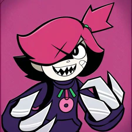 TrixieEE, Pink Hair, hair over one eye, sharp teeth, short hair, hairclip, black eyes, side ponytail, bandaid on face