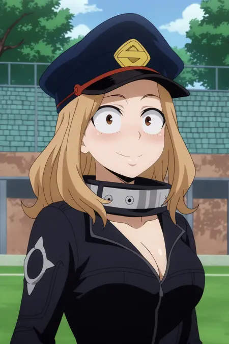트리거: camie utsushimi,1girl,solo,breasts,hat,bodysuit,upper body,looking at viewers,black bodysuit,peaked cap,blonde hair,large breasts,wide-eyed,smile,cleavage