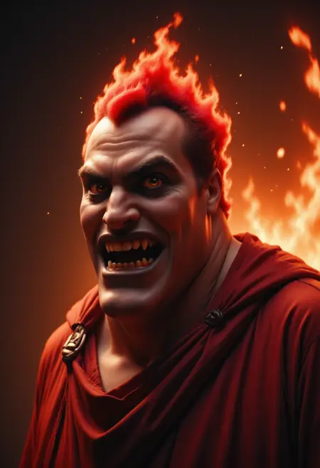 赤い炎のような髪と赤い肌で、非常に怒った表情 [\本物の怒りの表情を出すために]