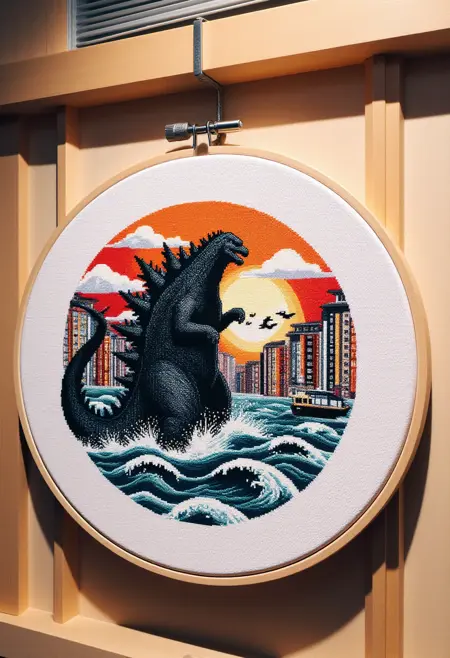 - (場所)の壁に掛けられた、(サブジェクト)を描いた細かい刺繍作品を撮影した写真。