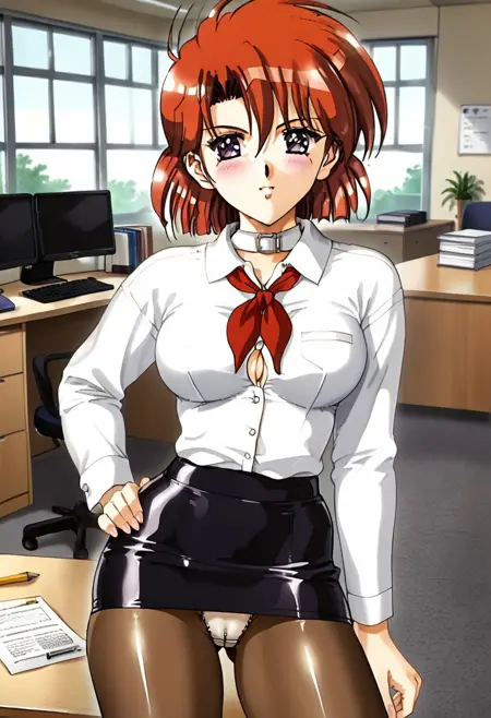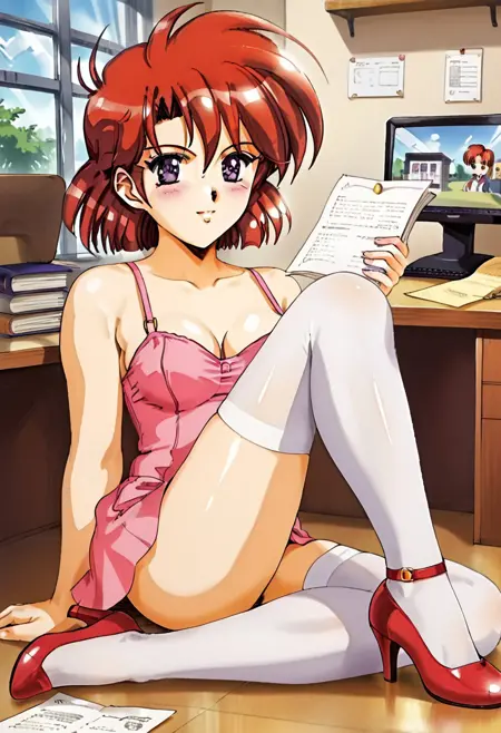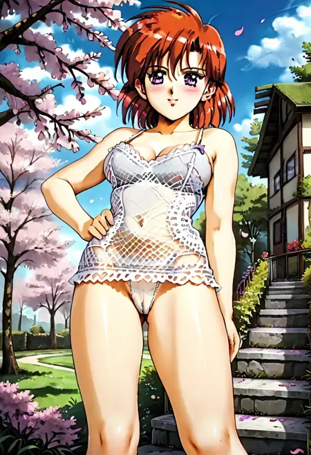 1 girl, pretty face, purple eyes, short hair, redhead, medium breasts
