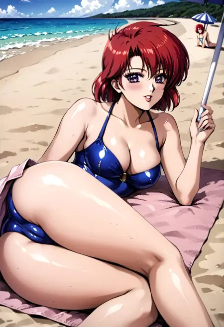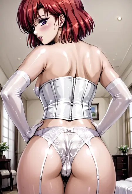 Eva, cute face, purple eyes, detailed pupils, red hair, short hair, medium breast,