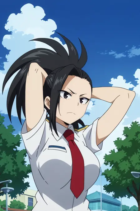 학교 복장: momo yaoyorozu, 1girl, solo, breasts, large breasts, ponytail, hair pulled back, shirtu.a. school uniform, scholl uniform, red necktie, necktie, wide ponytail, long hair