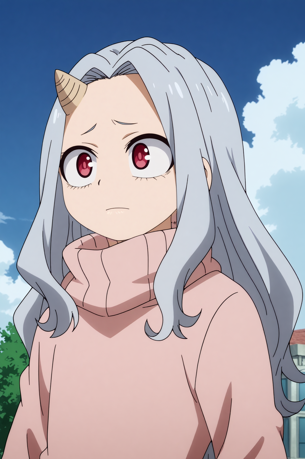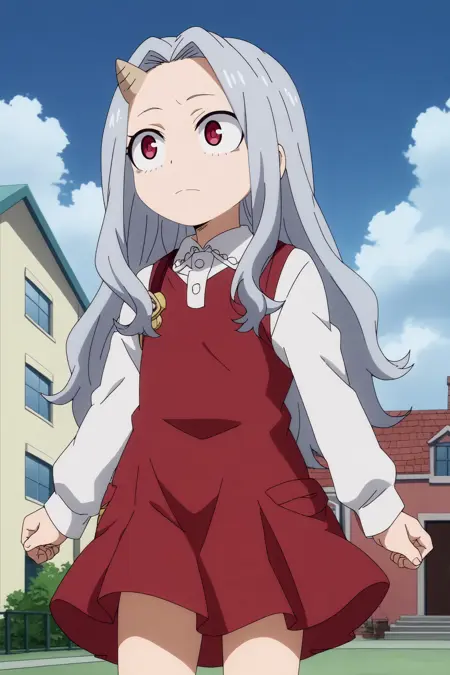 触发词:eri,1girl,solo,single horn,horns,long hair,grey hair,looking at viewers,female child,shirt, long sleeves, dress, white shirt, collared shirt, red dress, pleated dress