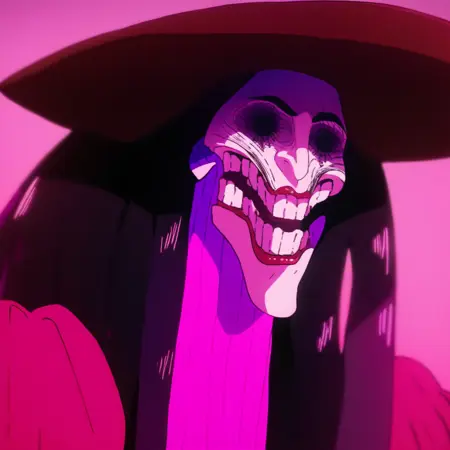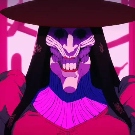 AcrobaticsilkyDDDanime1, round hat, red dress, hat, dress, long hair, dark hair, black hair, empty eyes, teeth, grin,