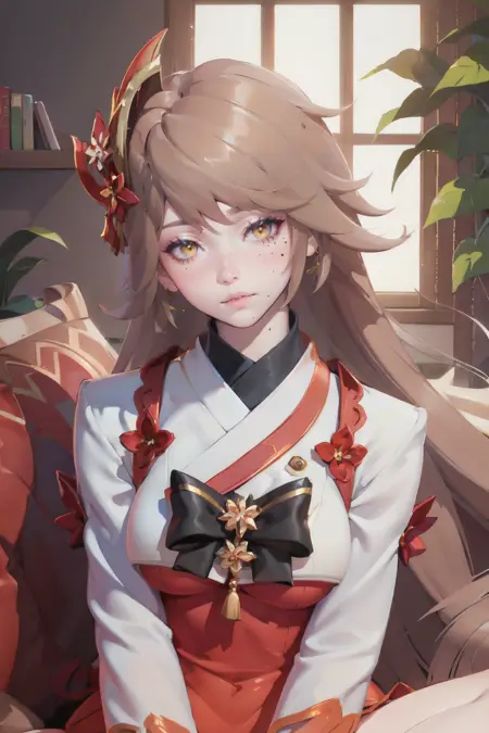 프롬프트: Sinestrea_FoS, 1girl, solo, long hair, hair ornament, brown hair, bangs, earrings, looking at viewer, yellow eyes, mole, mole under eye, lips, closed mouth, breasts, mediun breasts, dress, short dress, japanese clothes, long sleeves, skirt, orange skirt, legs, thighhighs, white thighhighs, single thighhigh, floral print, anklet, barefoot, jewelry, bell