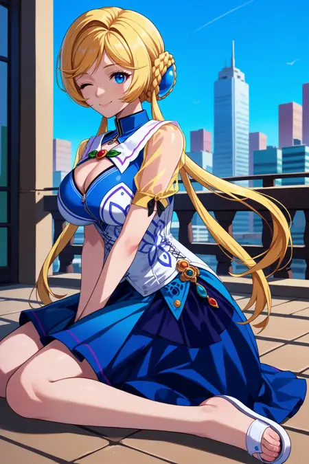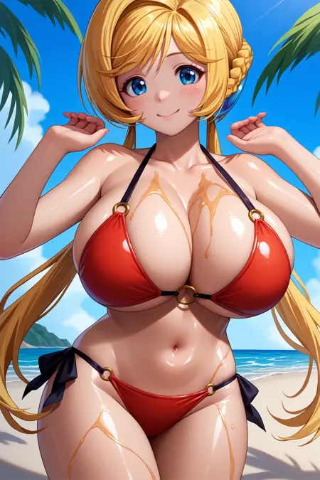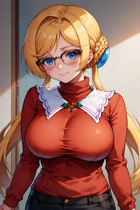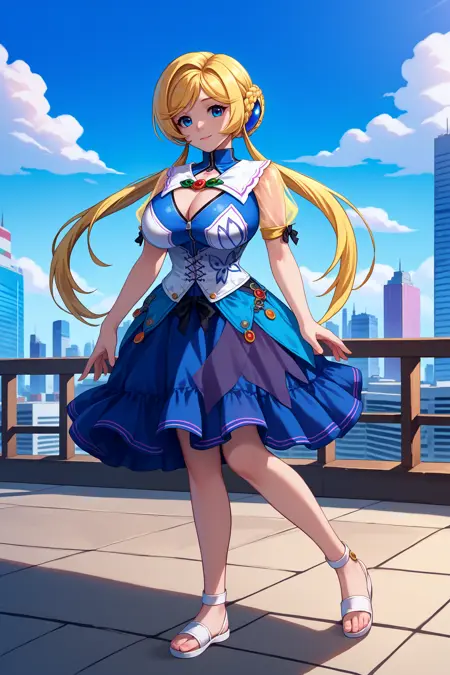 触发词为“srwMelua”,且“金色头发、低双马尾、蓝眼睛、辫子、发饰”为必选。