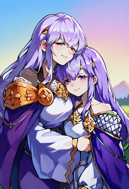 태그: 보라색 머리카락, 보라색 눈, 원형 왕관, 긴 머리카락, 흰색 드레스, 어깨 노출, 보라색 망토, 리본, 브로치, 흰색 소매