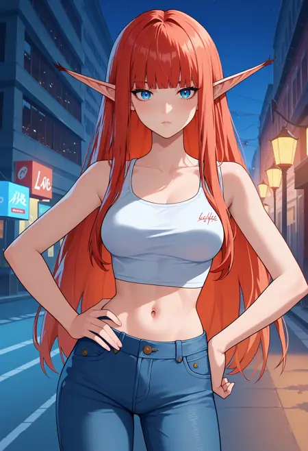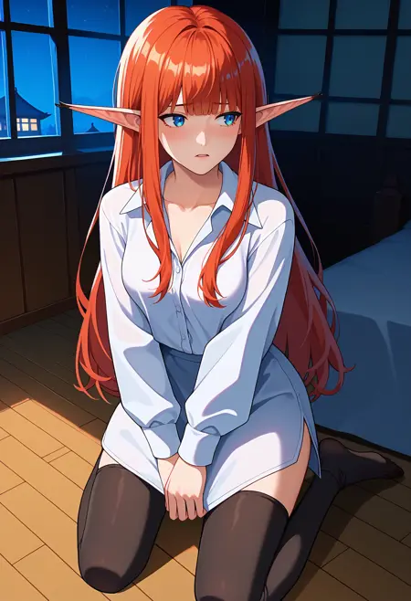 KJOeiselin, red hair, blue eyes, pointy ears, blunt bangs, long hair,