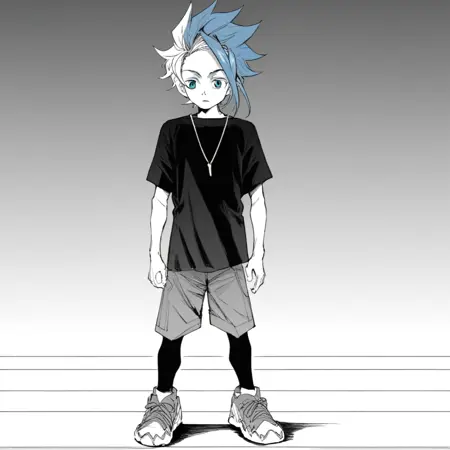 | 학습된 단어 | 1boy,solo,ekusu,two-tone hair,blue hair,yellow hair,pale skin,blue eyes,spiky hair,multicolored hai복사됨! white hooded jacket,short sleeves,black tutleneck undershirt,dark blue shorts,black leggings,sneakers복사됨! manga,grayscale,monochrome복사됨! black t-shirt.necklace,short sleeves,dark blue shorts,black leggings,sneakers복사됨! |