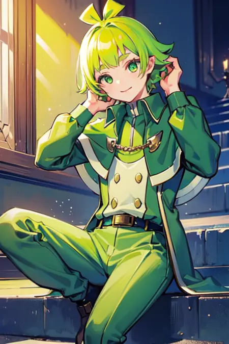 프롬프트 가이드: 1boy, 녹색 머리카락, 녹색 재킷, 녹색 겉옷 / 옵션: 솔로, 남성 중심
