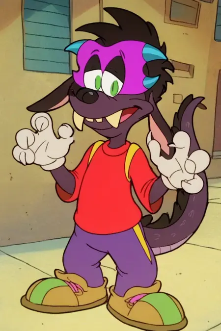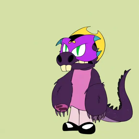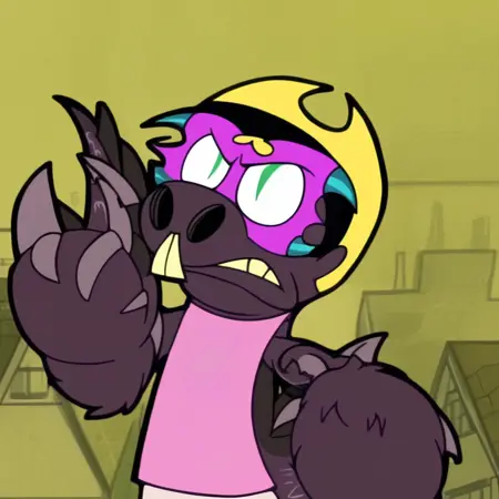- 발: 보라색 마스크, 비버의 마스크, 변신, 당나귀, 족제비, 도마뱀의 혼합, 이빨, 날카로운 이빨, 초록색 눈, 50% 변신, 큰 구멍이 있는 코, 늘어난 앞니, 진한 보라색 털, 도마뱀 같은 꼬리, 발톱이 있는 발, 초록색 눈, 수직으로 갈라진 동공