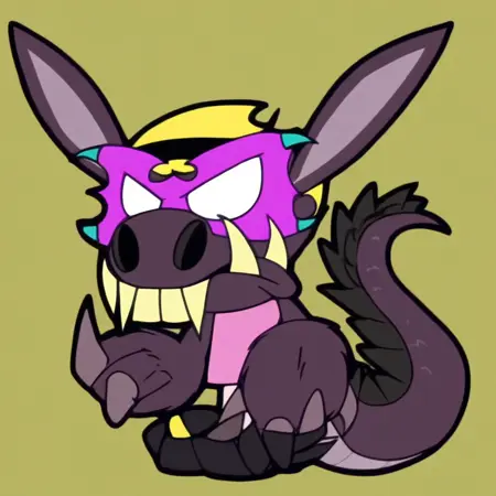 - 코뿔소 이빨과 귀: 보라색 마스크, 비버의 마스크, 변신, 당나귀, 족제비, 도마뱀의 혼합, 초록색 눈, 발톱, 75% 변신, 큰 구멍이 있는 코, 늘어난 앞니, 진한 보라색 털, 도마뱀 같은 꼬리, 발톱이 있는 발, 당나귀 귀, 코뿔소 이빨, 초록색 눈, 수직으로 갈라진 동공