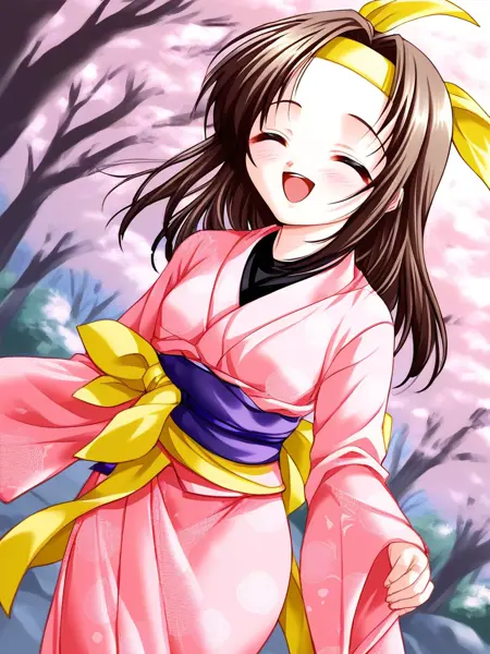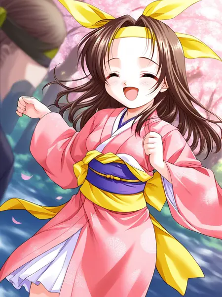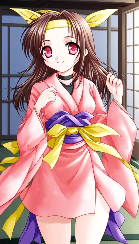 Momo(Makoku), 1girl, solo, 갈색 머리, 분홍 눈, 노란 머리띠, 긴 머리, 작은 가슴,