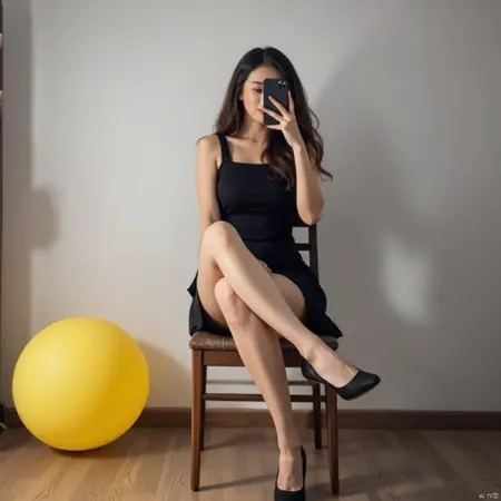 추천 프롬프트: 휴대폰으로 셀카를 찍으세요. 여성이 흰색으로 칠해진 방에 서서 휴대폰을 얼굴 앞으로 들어 올리고 있습니다. 그녀는 검은 치마, 흰색 블라우스, 검은 티츠를 입고 있으며, 신발은 검은색입니다. 머리는 길고 파동 모양이며, 벽 뒤에 그림자가 비치고 있습니다. 그녀의 왼쪽에는 흰색 커튼이 걸린 검은 문이 있습니다. 그녀의 왼쪽에는 흰색 커튼이 걸린 검은 문이 있습니다.