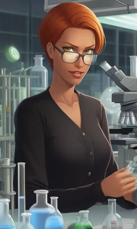 1woman,glasses,((tanned skin)),short ginger hair, brown eyes, black sweater,black pants