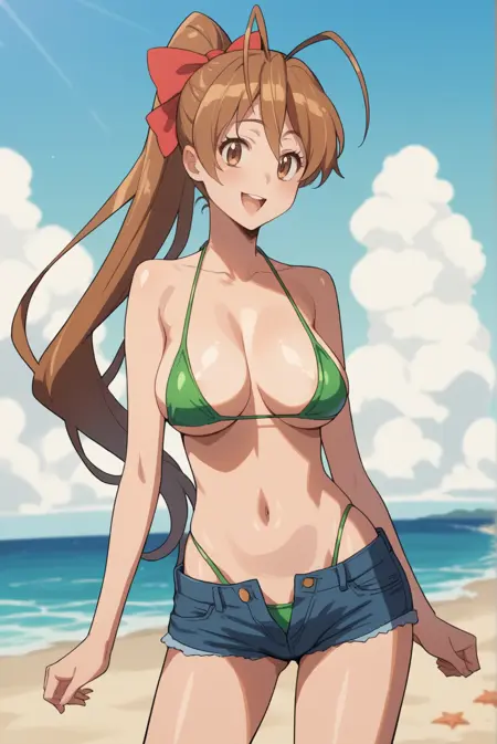 outfit_4, 光沢のある肌, 緑のビキニ, ハイレグビキニ, デニムショートパンツ, 短いショートパンツ, カットオフ, ボタン開放, フライ開放,