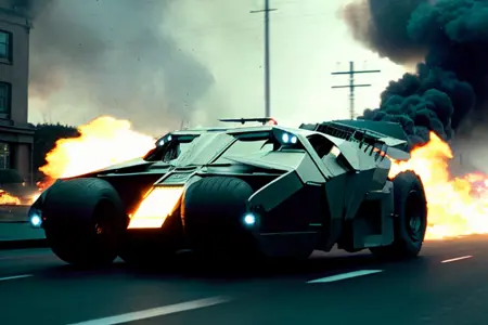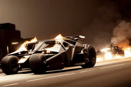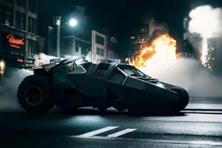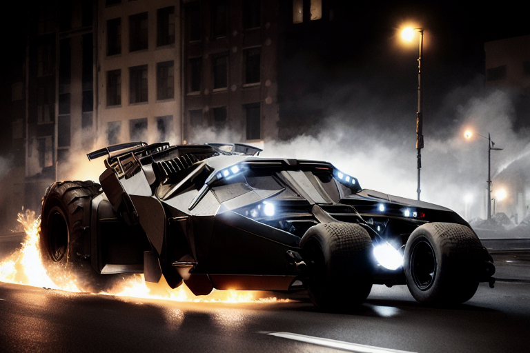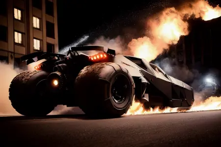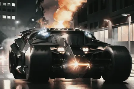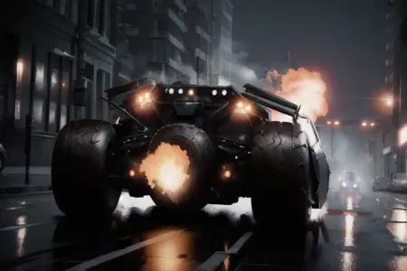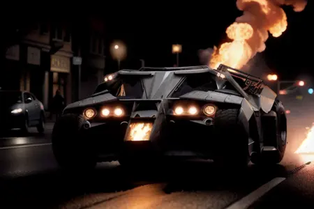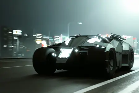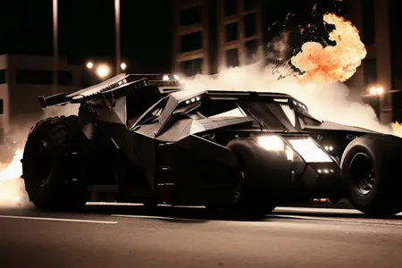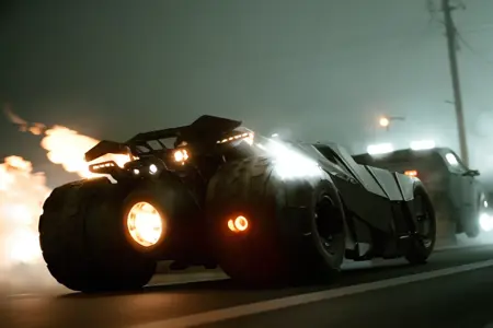 蝙蝠战车由韦恩企业的应用科学部设计。其装甲强度足以在不遭受重大损伤的情况下突破混凝土屏障。车身后部配备喷气发动机(带加力燃烧室),可实现快速加速或无坡道跳跃。车辆前部经过重装甲强化,可作为实用的进攻性撞击手段。武器系统包括一对安装在前轮之间车头部位的自动炮,以及一组火箭发射器。车尾可部署爆炸性棘刺,任何与其接触的车辆都会受到影响。隐身模式通过多种隐身技术避免被探测,这些技术可降低雷达、红外、可见光、无线电频谱和声音的反射/辐射;车辆灯光和主发动机停用,由辅助电动机驱动。这使得车辆在夜间或黑暗环境中极难被发现,并能轻易摆脱追击者。