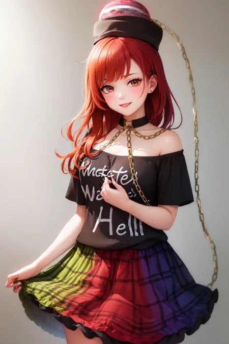 Default Outfit: polos crown, off-shoulder shirt, clothes writing, short sleeves, multicolored skirt, plaid skirt, choker, chain, bare shoulders