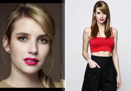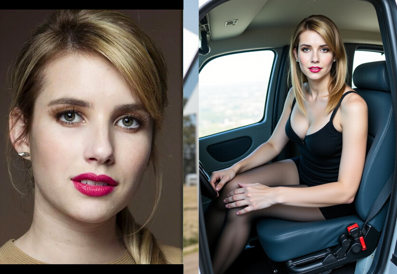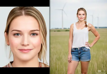 Trigger prompt: fchlpr, Side-by-side amateur photos: a close-up portrait and a half-body shot of a woman