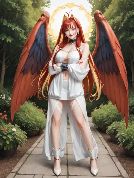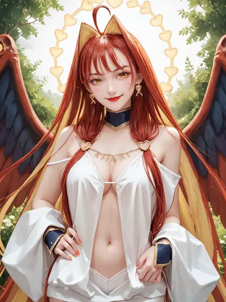white dress, bare shoulders, long sleeves, center opening, puffy sleeves, navel, detached collar, halo, wrist cuffs, heart, jewelry, heart earrings, red wings