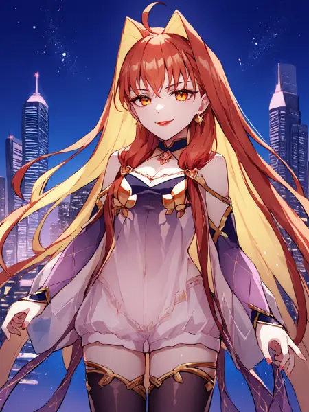 发丝飘动,长发,多色发,金发,红发,双色发,呆毛,橙色眼睛,妆容,口红,大胸