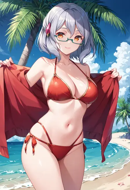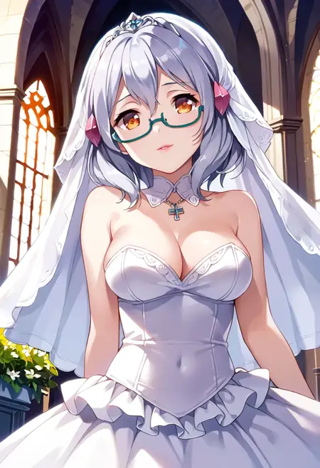 Miranda, glasses, orange eyes, hair ornament, semi-rimless eyewear, grey hair, short hair,