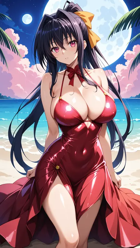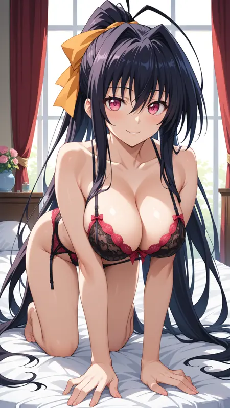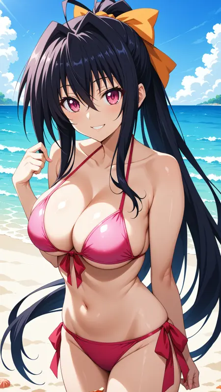 トリガー語: 1girl, akeno himejima, high school dxd, long hair, black hair, ribbon, purple eyes, large breasts,