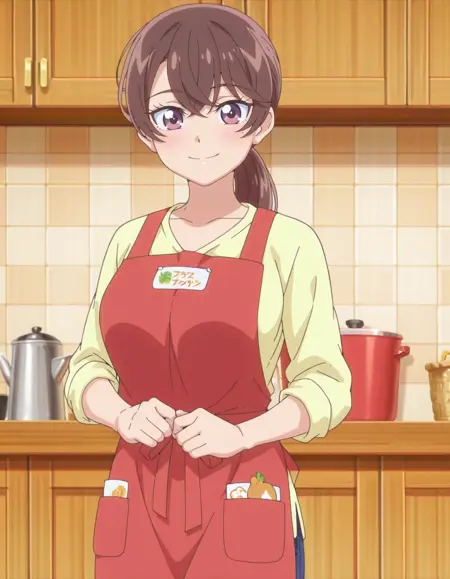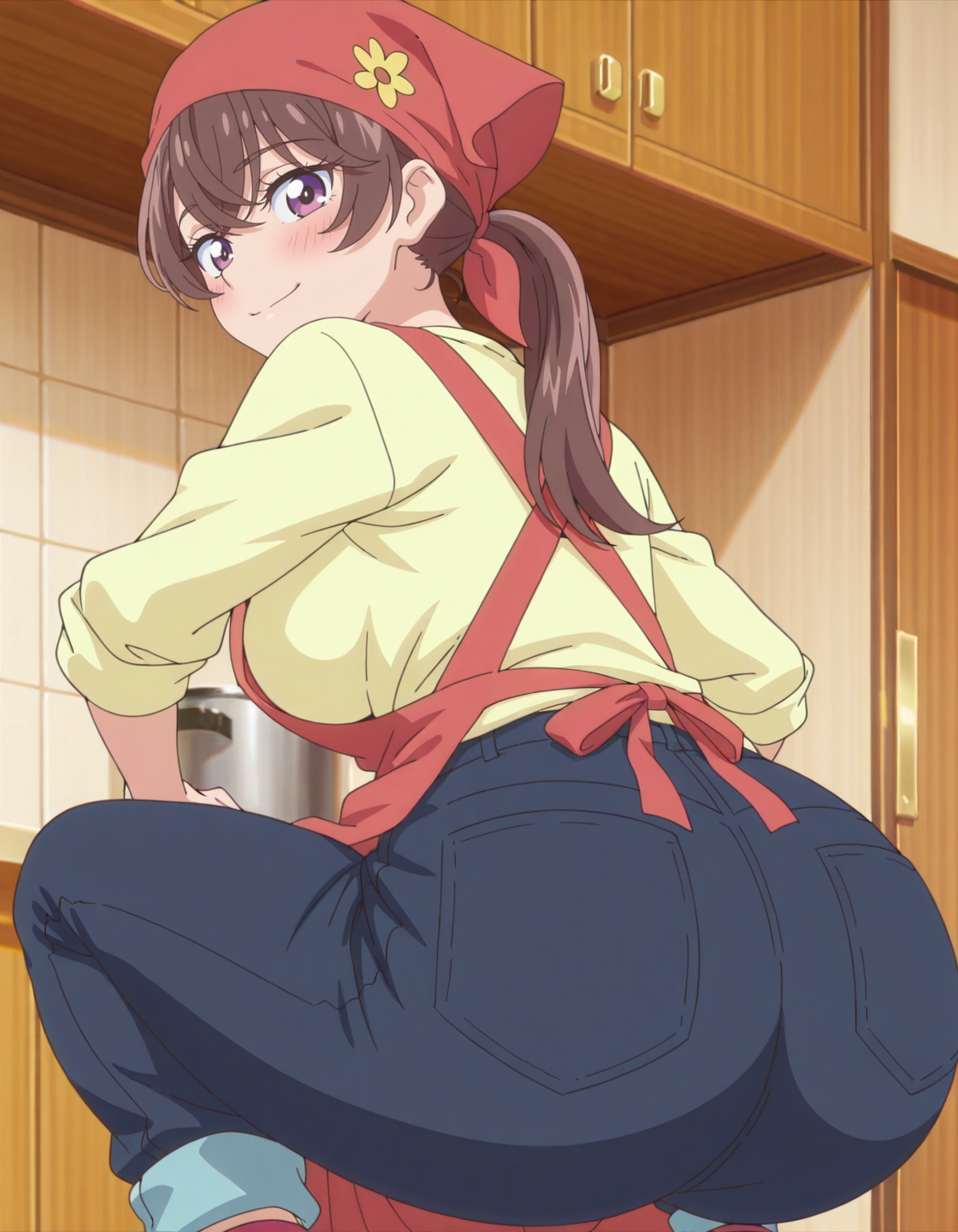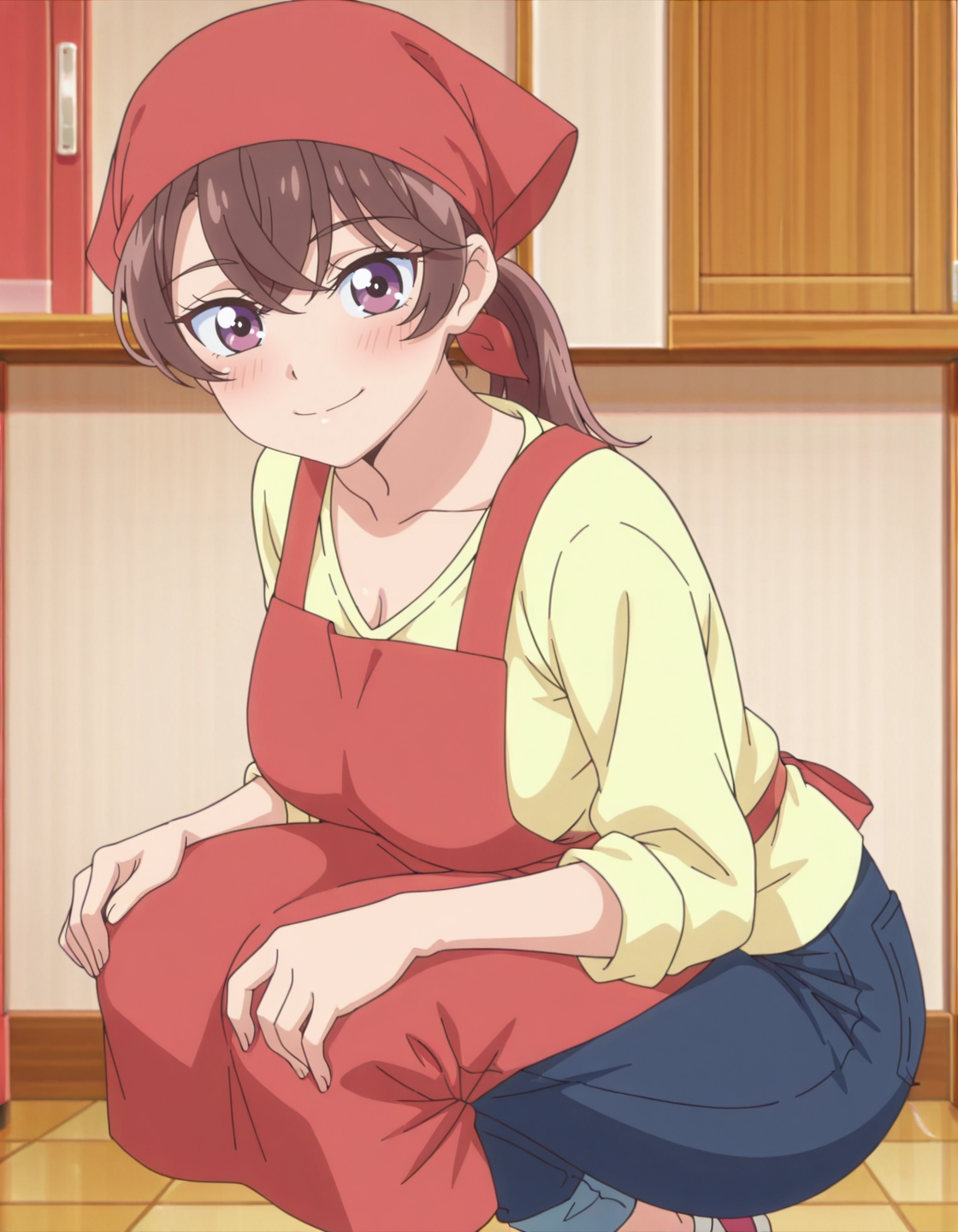 score_9, score_8_up, score_7_up, anime screencap, solo,1girl,apron,bandana,pants, brown hair, purple eyes, collarbone, yellow shirt, ponytail, bangs, long hair,hair between eyes,lora:nagomiakiho:0.8
