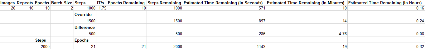 I spent quite a while toiling over calculations for how many steps it would take for my LoRAs to cook and, by extension, how long it would be, until I decided to make a sheet for it and then, I realized how useful it would be to share it with others. So, here you all go!