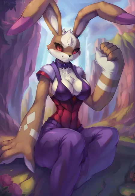 触发词:antylamon、digimon、兔子、兔形目、红眼睛、大耳朵、红色巩膜、手臂纹路、垂耳、穿着衣物、长耳、多色耳朵、长臂、围巾、盔甲、胸甲、白色瞳孔,