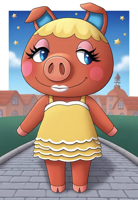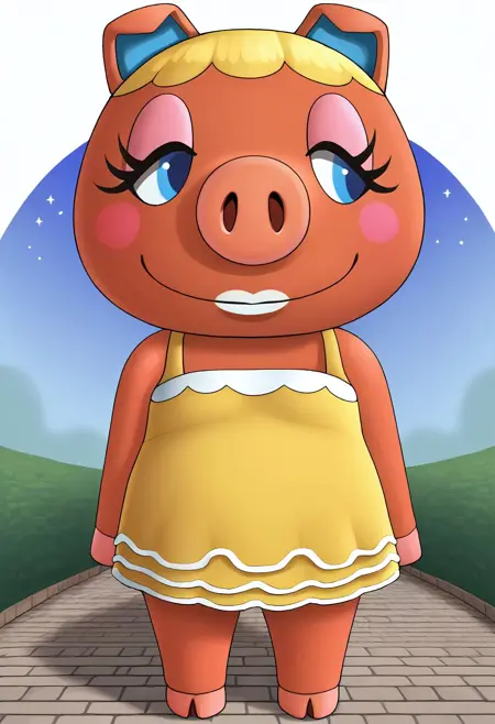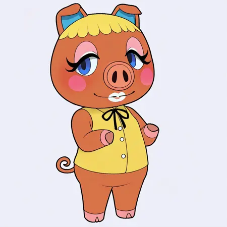 トリガータグ: "/Pancetti (Animal Crossing/), イノシシ, イノシシの鼻, イノシシの耳, イノシシの尾, 白いリップ, オレンジ色の肌, 青い目, 長いまつ毛, チークブラッシュ"