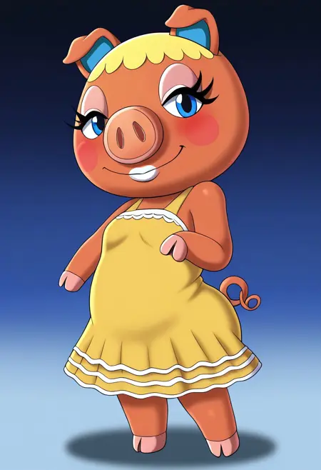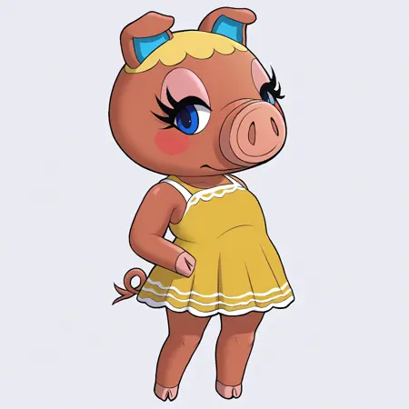 트리거 태그: "/Pancetti (Animal Crossing/), 돼지, 돼지 코, 돼지 귀, 돼지 꼬리, 흰색 립스틱, 주황색 피부, 파란 눈, 긴 속눈썹, 볼빨간색"