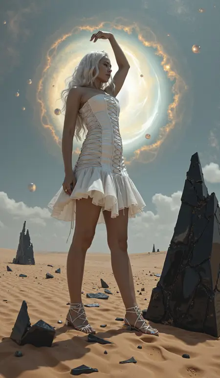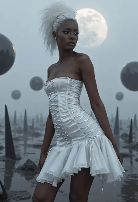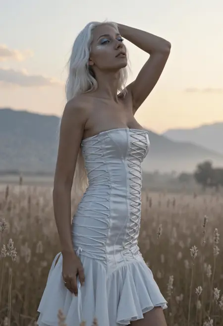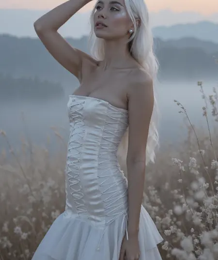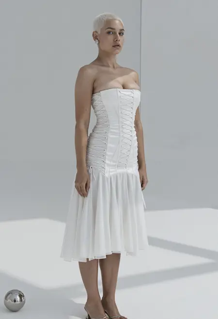 a strapless dress in a soft peach color, designed with a fitted, corset-like bodice that showcases lace-up details along the sides. It has a flared, ruffled hemline