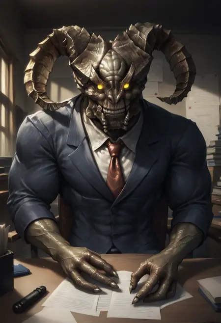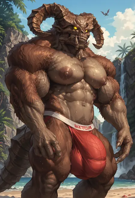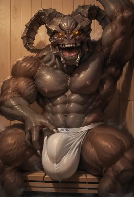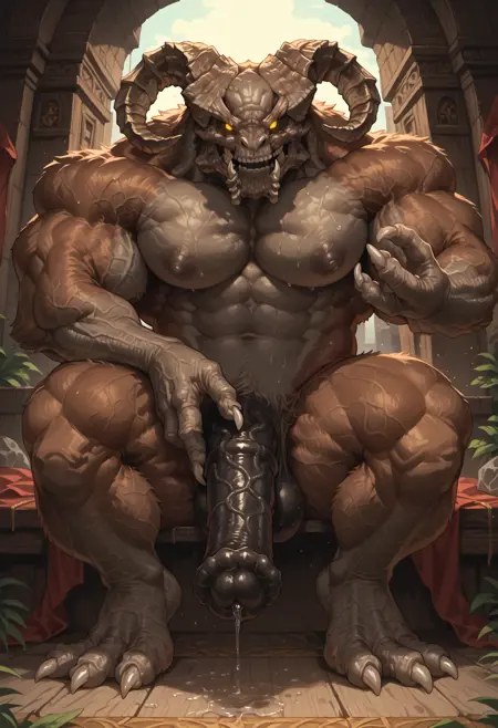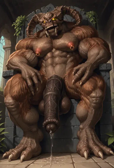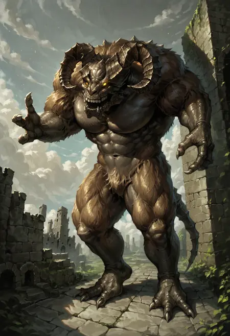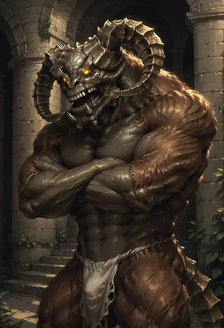 Trigger words (ILXL) : t4urusd3m0n, monster, demon, horns, fur, claws, teeth, yellow eyes, no pupils, 3 fingers, bone tail